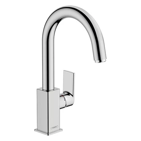 The geometric Vernis Shape variant, with its precise edges, stands for a visually striking look. The single lever basin mixer features a swivel spout that can be adjusted in 2 steps 120° or 360° and comes supplied with a pop-up waste. EcoSmart technology reduces the flow rate to save water and energy.