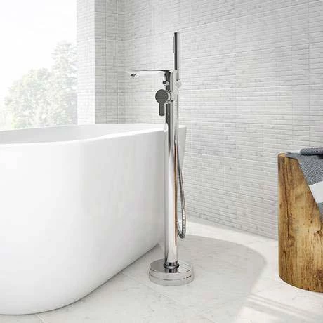 This 950mm tall Madrid Freestanding Bath Shower Mixer offers versatile bathing while adding a splash of sophistication to your space. Suitable for modern bathrooms, it boasts contemporary curves and smooth flat surfaces for a chic look. Use the fixed projecting tap to fill your tub with bubbles or select the cylindrical shower head handset for washing hair and rinsing down. This high quality freestanding bath tap is crafted from robust brass with a chrome plated finish for a gleaming clean appearance. A single lever handle allows easy control of temperature and flow.