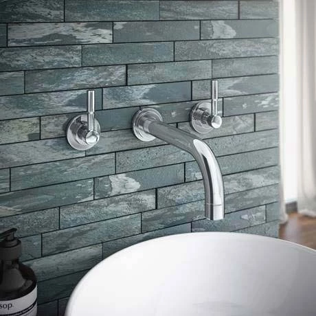 With its understated design and gleaming chrome finish the Primo Modern Wall Mounted Basin Mixer tap makes an elegant addition to your bathroom. The tap projects 220mm and features a gently curving downwards spout and two complementary wall mounted levers to control water temperature and flow. Made from solid brass this chrome mixer tap is dependable and its metal plated outer makes it simple to keep clean. Designed for use with countertop basins and bowls, pair with the Sol Round Counter Top Basin for a pared back aesthetic in your bathroom.